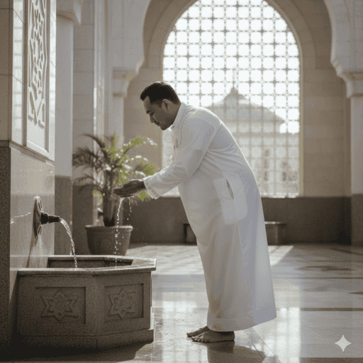 Gambar 1. Seorang pria Indonesia mengenakan jubah putih bersih, sedang berwudu dengan air yang mengalir lembut di tangannya di halaman masjid yang terang dan bersih.