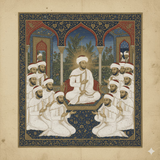 Gambar 2. Ilustrasi manuskrip kuno yang menggambarkan Nabi Muhammad (SAW) mengenakan pakaian putih, dikelilingi oleh para sahabatnya yang juga berpakaian putih, dalam gaya historis dan penuh hormat