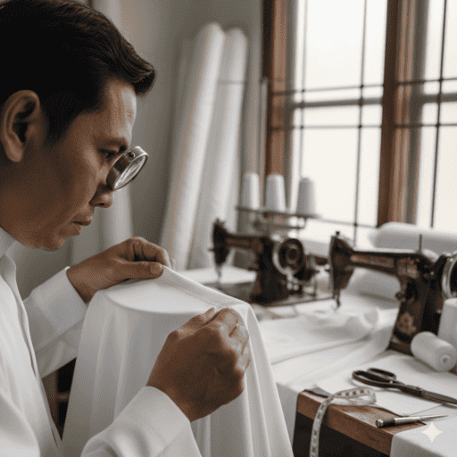 Gambar 3. Seorang penjahit memeriksa jahitan jubah putih dengan cermat, menyoroti keahlian dan perhatian terhadap detail. Latar belakang menunjukkan berbagai kain putih dan peralatan menjahit.