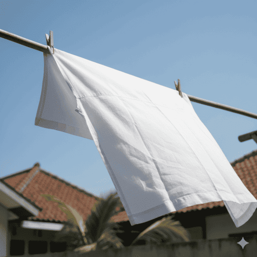 Gambar 4. Jubah putih bersih yang tergantung di jemuran di bawah langit biru cerah, melambai lembut tertiup angin. Kain putih itu bersinar di bawah cahaya alami, tampak segar dan bersih.